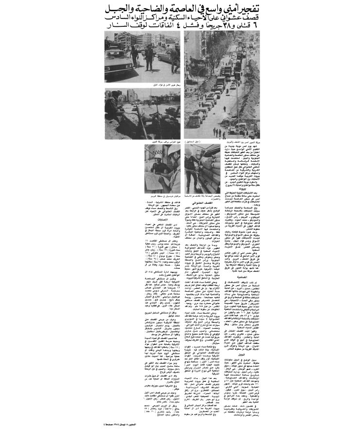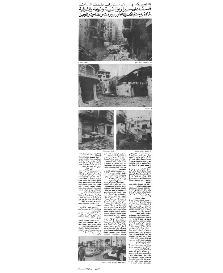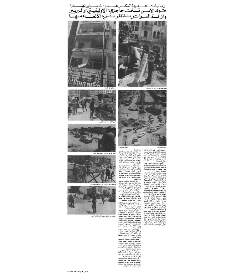 ... ومما يتندر به بعض اللبنانيين في معرض بيان ما انعقد بينهم وبين الحرب من ألفة إنهم كانوا يضبطون ساعاتهم مع تجدد القصف أو الاشتباكات هنا وهناك. وواقع الحال أن النادرة لا تخلو من صحة ما بدليل أن بعض المحاور سرعان ما اكتسبت صفة التقليدية وأن باتت تغطية أخبار هذه المحاور التقليدية جزءا لا يتجزأ مما تولم به اليوميات اللبنانية لقرائها.