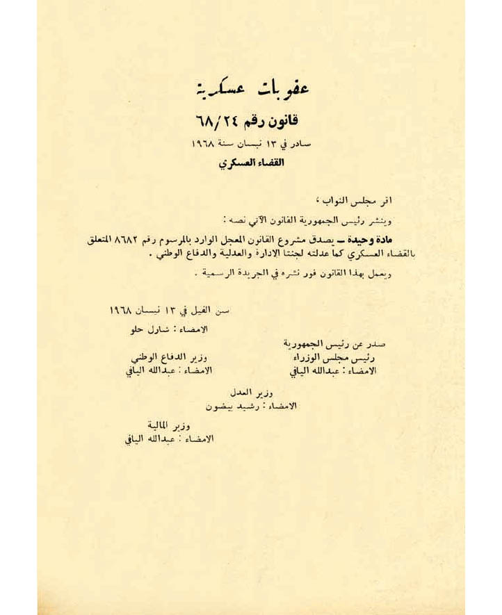 قانون القضاء العسكري رقم ٢٤/٦٨ الصادر في ١٣ نيسان سنة ١٩٦٨