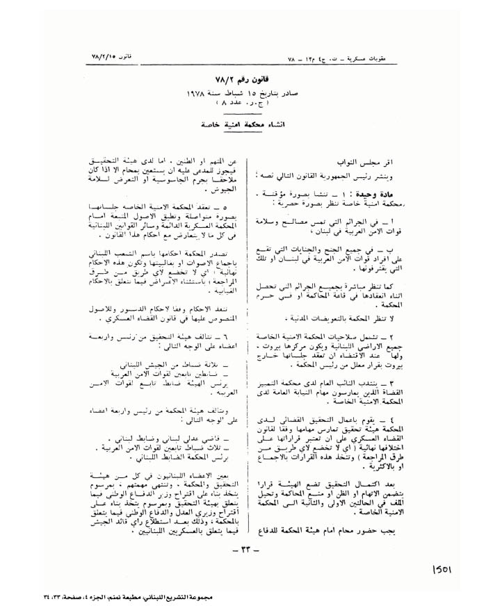 قانون إنشاء محكمة أمنية خاصة رقم ٢/٧٨ صادر بتاريخ ١٥ شباط سنة ١٩٧٨