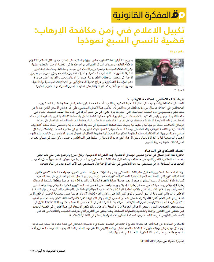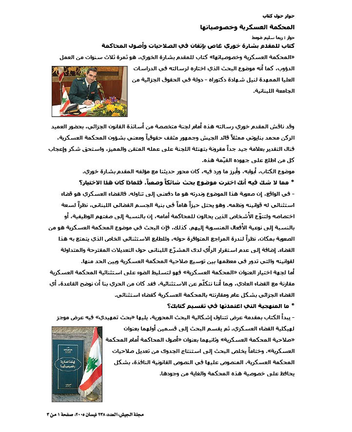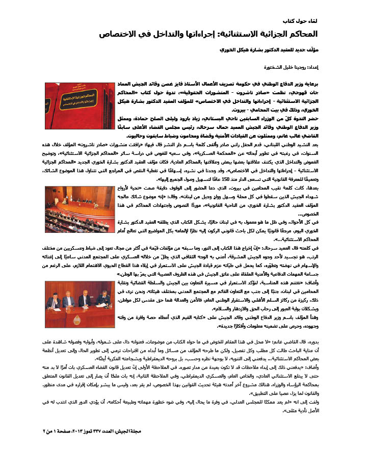 لا يكادُ يومٌ يَمْضي، بل لا يَمْضي يومٌ، من غير أنْ تَحْمِلَ وَسائِلُ الإعلامِ إلى اللبنانيّين واللبنانيّات أخبارًا مِنْ قَبيلِ أنَّ مفوّض الحكومة لدى المحكمة العسكريّة قد ادّعى على زيد من الناس، أو أنَّ المحكمة العسكريّة قد حَكَمَتْ على عمرو منهم، أو أنَّ محكمة التمييز العسكريّة قد وافقت على إخلاء سبيل سعيد؛ وهكذا حتّى ليُمْكِن القولُ، دون مبالغة، إِنَّ «المحكمة العسكريّة» باتت تَتَبَوّأ محلًا مركزيًّا من فَضائِنا القضائي.
