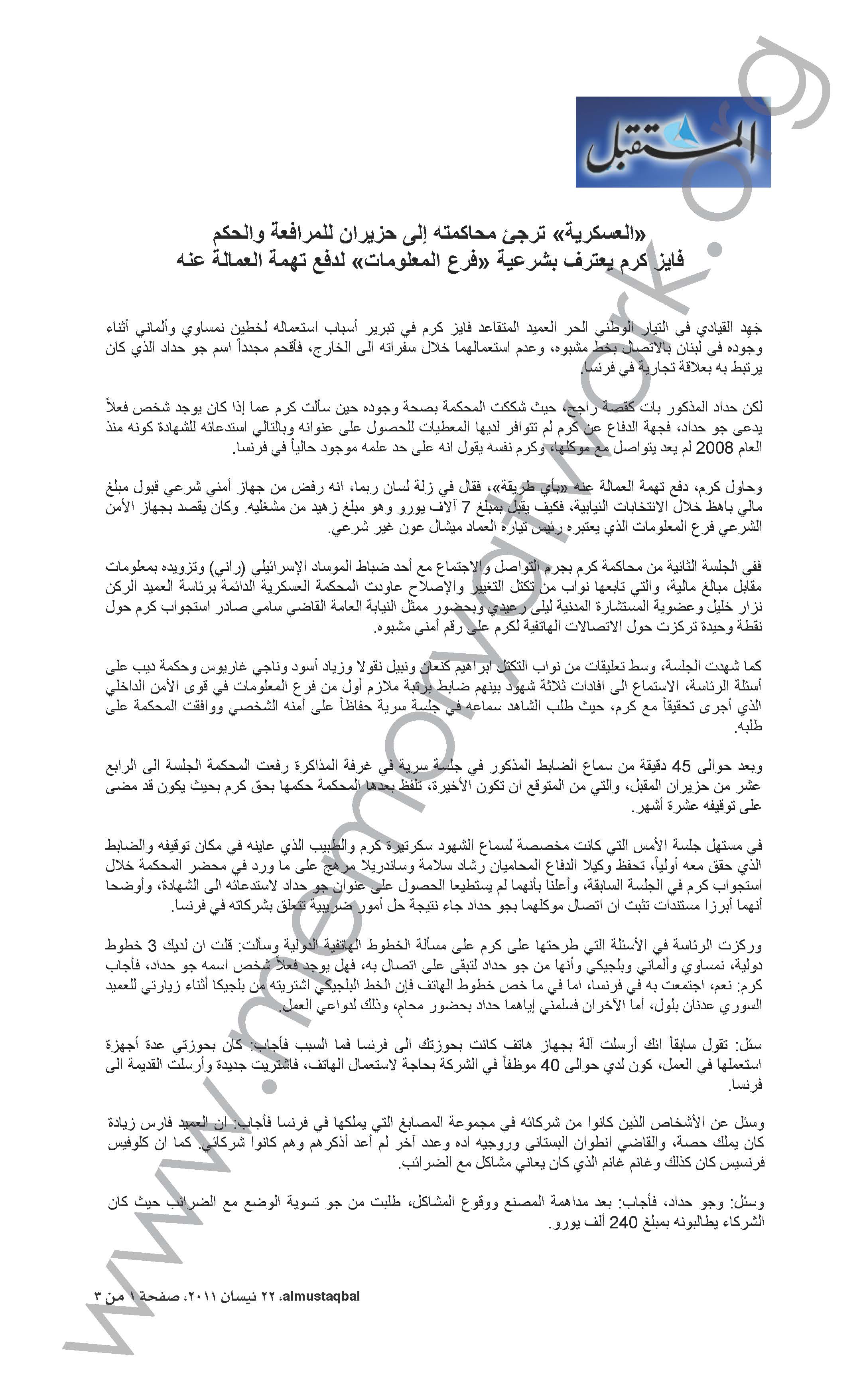 المستقبل، ٢٢ نيسان ٢٠١١