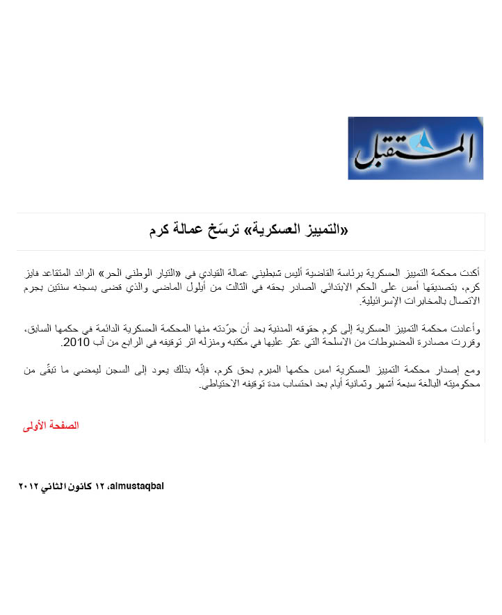 «التمييز العسكرية» تصدر حكمها بحق كرم اليوم