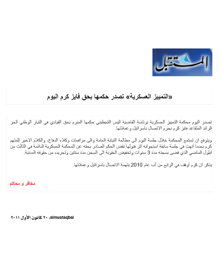 «التمييز العسكرية» ترجئ الحكم على فايز كرم إلى ٢٤ كانون الثاني