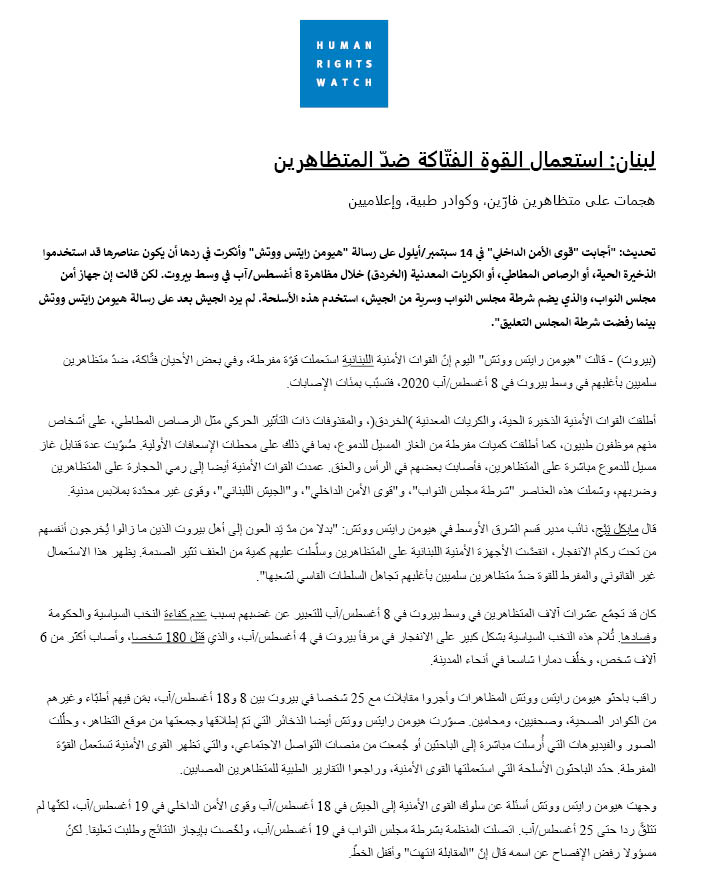 Human Rights Watch، ٢٦ آب ٢٠٢٠